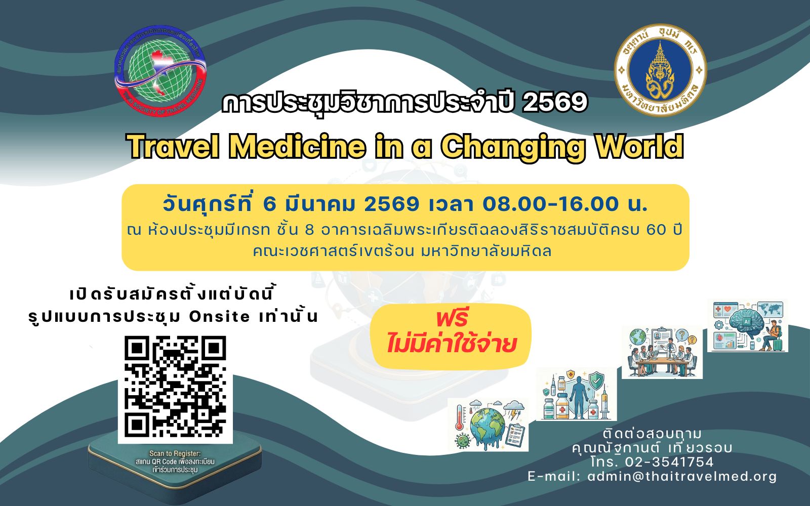 คณาจารย์ แพทย์ประจำบ้าน และพยาบาลจากคลินิกเวชศาสตร์การเดินทางและท่องเที่ยว เข้าร่วมประชุมวิชาการนานาชาติด้าน Travel Medicine ณ ประเทศสหรัฐอเมริกา ระหว่างวันที่ 11–15 พฤษภาคม พ.ศ. 2568 คณาจารย์ แพทย์ประจำบ้าน และพยาบาลจากคลินิกเวชศาสตร์การเดินทางและท่องเที่ยว คณะเวชศาสตร์เขตร้อน มหาวิทยาลัยมหิดล ได้เข้าร่วมการประชุมวิชาการนานาชาติ “The 19th Conference of the International Society of Travel Medicine (CISTM19)” ซึ่งจัดขึ้น ณ โรงแรม Hilton Riverside เมืองนิวออร์ลีนส์ รัฐลุยเซียนา ประเทศสหรัฐอเมริกา โดยการประชุมครั้งนี้ถือเป็นเวทีที่ใหญ่ที่สุดในแวดวงเวชศาสตร์การเดินทาง ซึ่งจัดขึ้นเป็นประจำทุก 2 ปี ในปีนี้ มีผู้แทนจากประเทศไทยเข้าร่วมทั้งหมด 13 คน จากหลากหลายสถาบัน ได้แก่ คณะเวชศาสตร์เขตร้อน มหาวิทยาลัยมหิดล, คณะแพทยศาสตร์ มหาวิทยาลัยเชียงใหม่, คณะแพทยศาสตร์ มหาวิทยาลัยศรีนครินทรวิโรฒ และหน่วยงานในสังกัดกระทรวงสาธารณสุข […]
